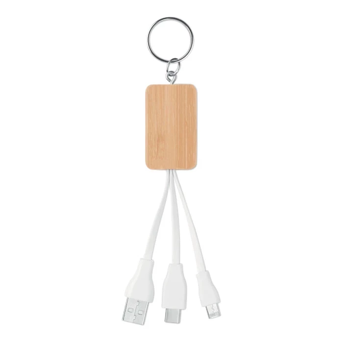 Brelok bambusowy z kablami do ładowania z USB-A na Micro-B (2 w 1) i typ C. Bambus jest produktem naturalnym, dlatego mogą wystąpić nieznaczne różnice w kolorze, wzorze i rozmiarze . (znakowanie na każdej sztuce produktu może się od siebie różnić)